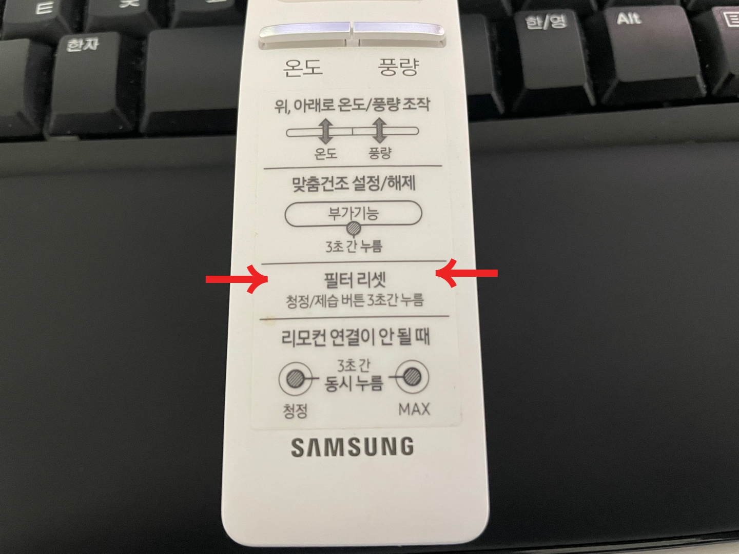 5) 필터 장착 후 에어컨 필터 리셋 방법 : 청정/제습 버튼을 3초간 누르면 리셋 완료.
