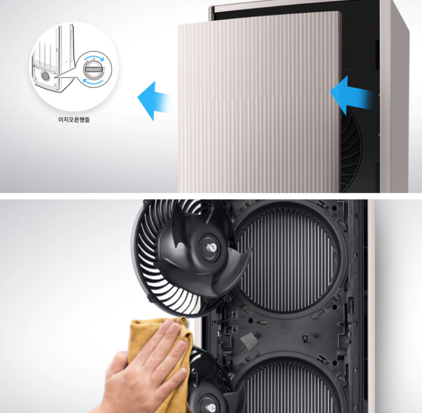 이지오픈패널로 삼성 비스포크 무풍갤러리 스탠드형 에어컨 AF19AX773EZRS은 별도의 도구 없이 분리가 가능해서 에어컨 내부를 청결하게 관리할 수 있어요. 셀프로 어렵지 않게 손에 닿지 않는 펜까지 이지오픈펜으로 관리할 수 있어요.