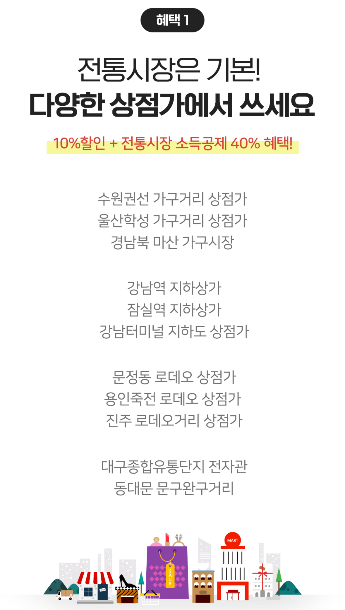 - 소득공제: 전통시장 사용분은 최대 100만 원까지 추가 공제 가능.