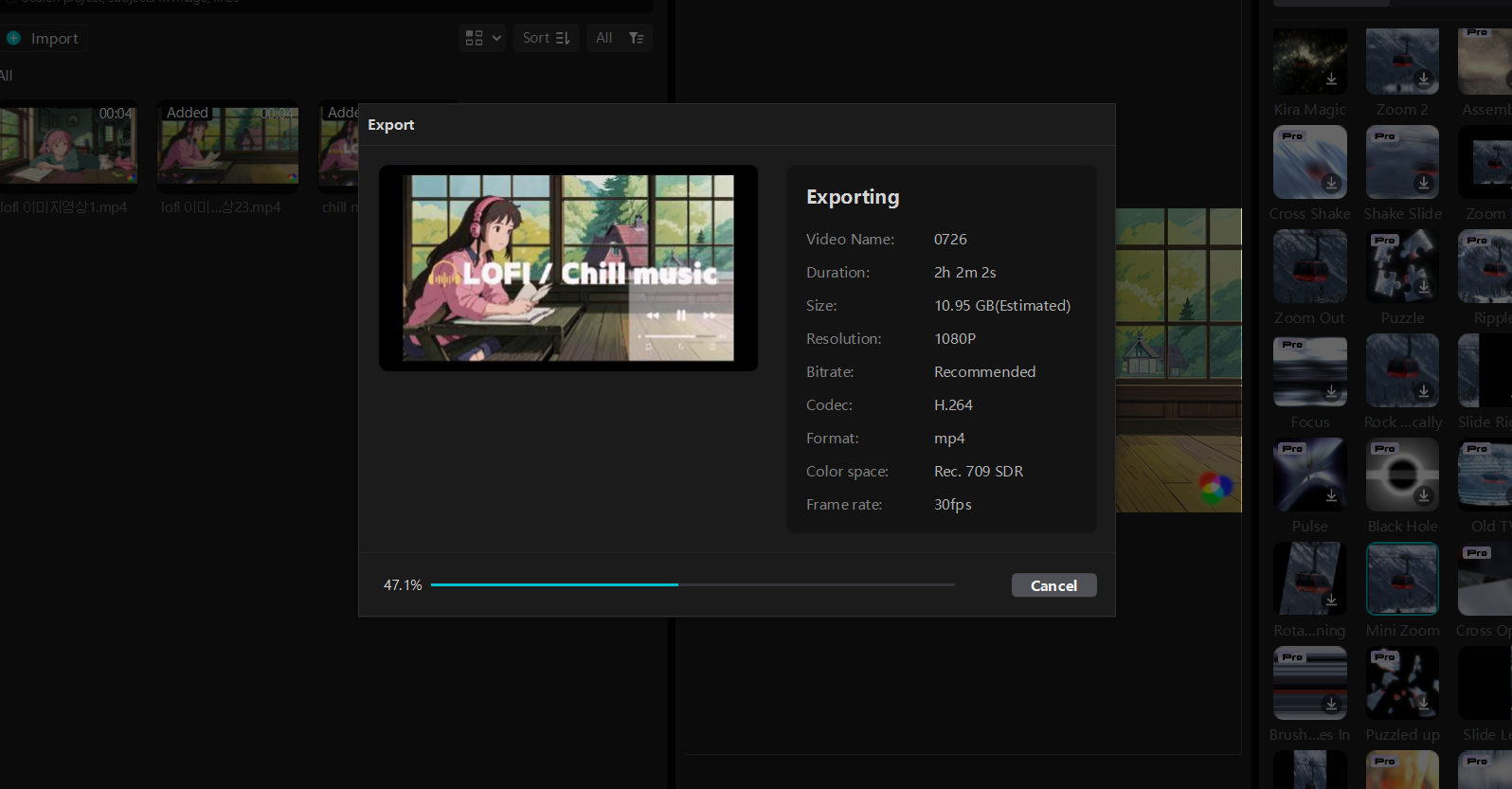 4. 여러 음악 넣어서 영상 1~2시간으로 늘리기