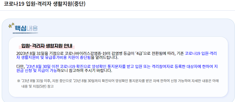 코로나 입원 및 격리자 생활지원금 지원이 2023년 8월 31일을 기점으로 감염병 등급 4급으로 전환되면서 중단되었습니다.