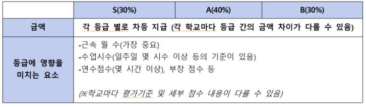 성과급(성과상여금)은 S, A, B 등급에 따라 차등 지급됩니다. 이 기준은 학교마다 성과상여금 기준을 달리하며 가장 중요한 부분은 근속 월수와 수업시수일 것입니다.