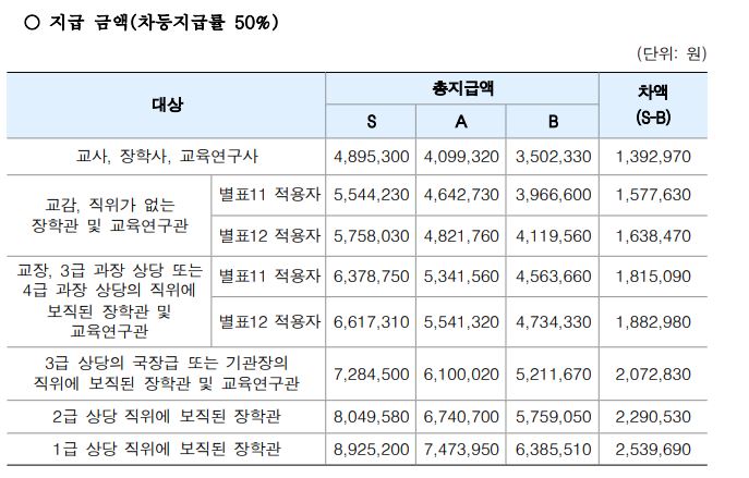 지급 기준액을 토대로 학교별 차등지급률에 따라 다르지만, 우선 50% 지급 금액을 알려드리겠습니다.