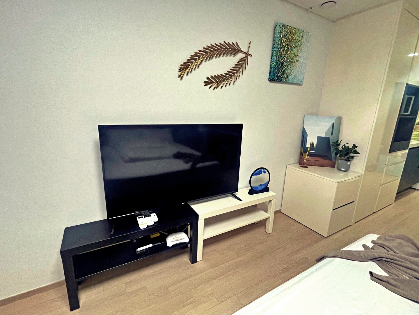 강릉영진코아루비치테라스에서 단기임대, 숙박업을 하시는 분들이 많은 것 같았어요. (엘리베이터에 분은 게시물만 봐도^^) 숙소 내부는 우리가 익히 아는 원룸 오피스텔과 같아요. 단기임대지만, 침대, TV, 테이블, 소파, 탁자, 테라스테이블, 전자레인지, 하이라이터, 전기밥솥, 커피포트, 식기류, 수건, 욕실용품(샴푸, 바디워시, 비누, 휴지) 등 기본적인 물품들은 구비가 되어있어요.